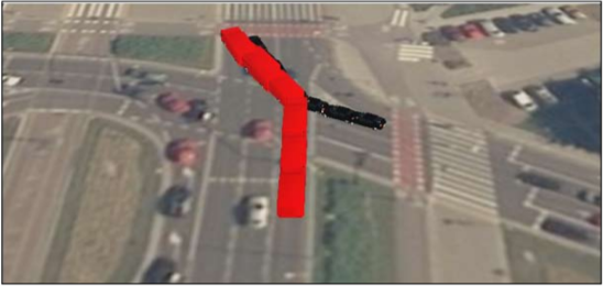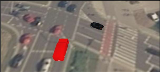C. Stan powypadkowy obrazujący skrzyżowanie utrwalone na podstawie fotomapy z naniesionymi pojazdami marek Volkswagen T5 (większy, czerwony) i Renault Megane (mniejszy, czarny).