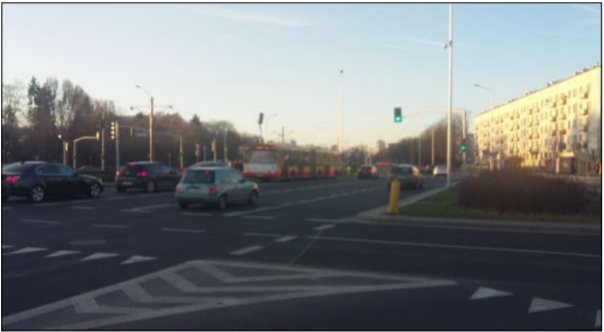 Kolejne, poniższe, zdjęcie przedstawia sytuację przedwypadkową. Jak widać, ruch ulicą W., którą jechał kierujący volkswagenem T5, jest otwarty zielonym sygnałem świetlnym. Od strony ulicy O., którą jechał kierujący renault, ruch jest zamknięty czerwonym sygnałem świetlnym. Jest charakterystyczne, że ruch ulicą O. jest zamknięty jedynie dla pierwszej jezdni poprzecznej (ulicy W.). Z kolei przejazd przez drugą jezdnię poprzeczną, względem przedłużonego ruchu dla ulicy O., jest otwarty widocznym w głębi zdjęcia zielonym sygnałem świetlnym. Kierujący samochodem renault niewątpliwie zasugerował się owym zielonym światłem, właściwym dla następnej jezdni. Natomiast nie dostrzegł czerwonego światła dla jego pozycji w ruchu, wszak był zbyt blisko sygnalizatora, którego sygnał zasłoniła mu opuszczona osłona przeciwsłoneczna. Opuszczenie osłony było konieczne, słońce operowało bowiem intensywnymi promieniami w kierunku, z którego nadjeżdżał tenże kierujący. W konsekwencji wjechał na skrzyżowanie przy czerwonym sygnale świetlnym i tym samym doprowadził do zderzenia z samochodem volkswagen T5.